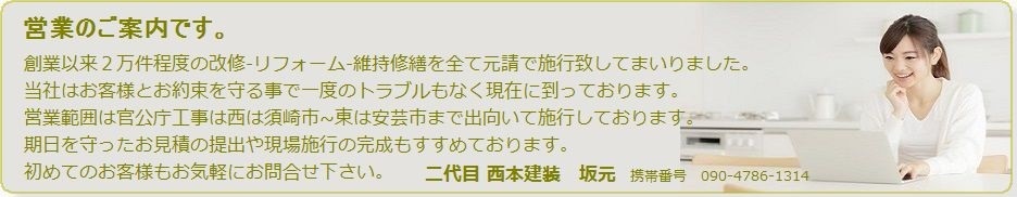 HOME 会社概要 官公庁工事 高知知事許可 28-9895号 高知市槙山町9-17 電話 088-844-5611総合建築 西本建装