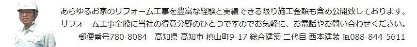 〒780-7840 高知県高知市槙山町9番17号 ☎088-844-5611 fax088-840-0798 総合建築 西本建装 |
