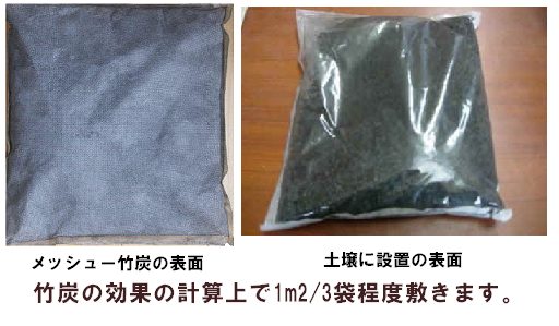 A当社の竹炭は30pの袋に入ってますのでどなたでも簡単に子供達でも敷く事ができます。(メッシュ-部分を上にします)